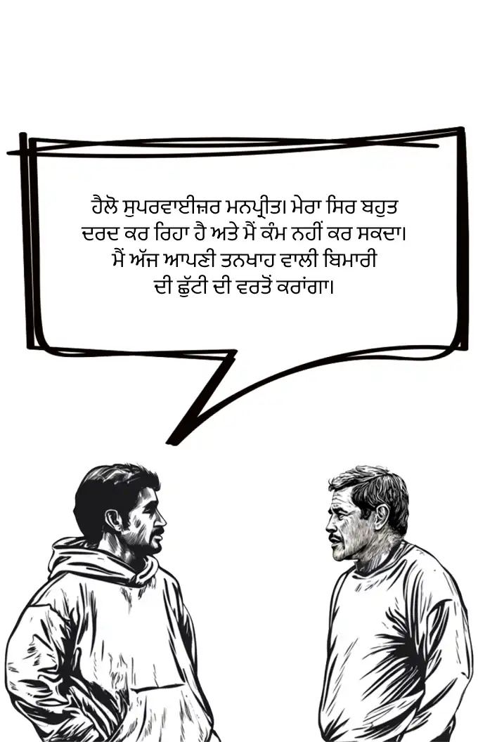 ਜ਼ੁਬਾਨੀ ਜਾਂ ਲਿਖਤੀ ਰੂਪ ਵਿੱਚ ਸੂਚਿਤ ਕਰੋ ਕਿ ਤੁਸੀਂ ਬਿਮਾਰੀ ਦੀ ਛੁੱਟੀ ਦੀ ਵਰਤੋਂ ਕਰੋਗੇ। ਡਾਕਟਰੀ ਨੋਟ ਦੀ ਲੋੜ ਨਹੀਂ ਹੈ ਅਤੇ ਤੁਹਾਡਾ ਮਾਲਕ ਤੁਹਾਨੂੰ ਤੁਹਾਡੀ ਜਗ੍ਹਾ ਤੇ ਕੰਮ ਕਰਨ ਲਈ ਕਿਸੇ ਨੂੰ ਲੱਭਣ ਲਈ ਨਹੀਂ ਕਹਿ ਸਕਦਾ।